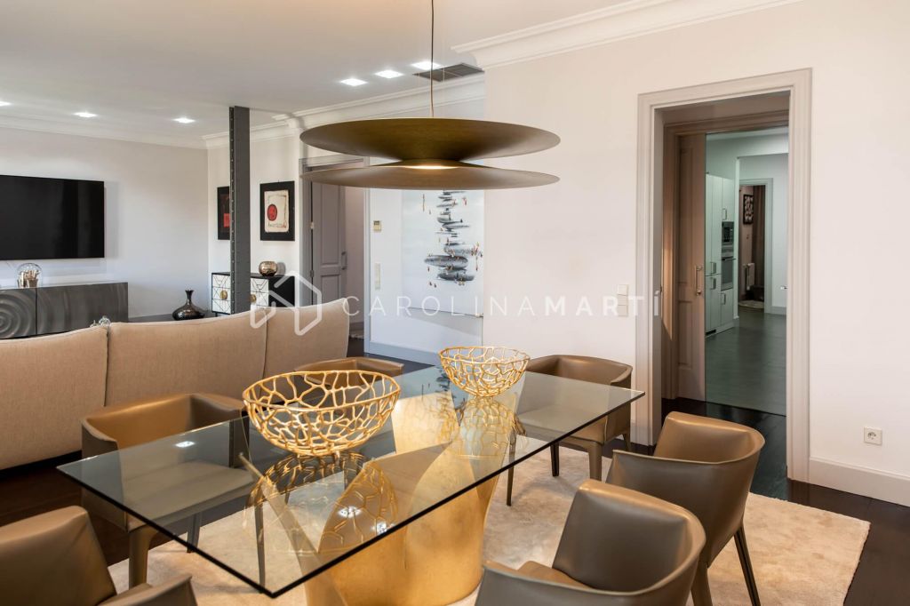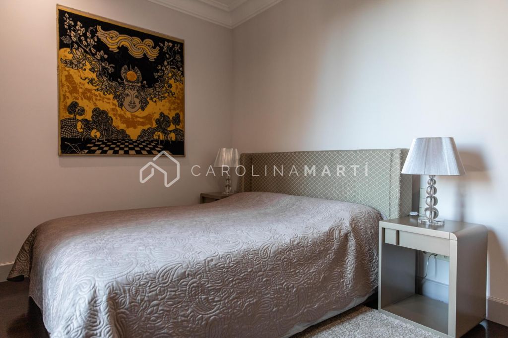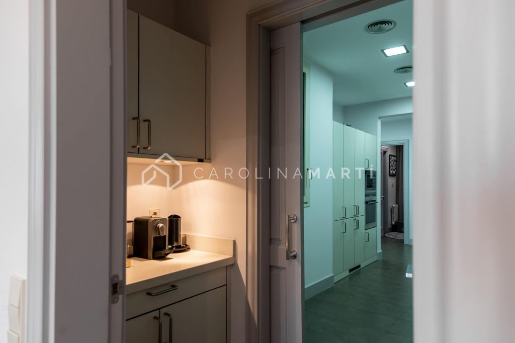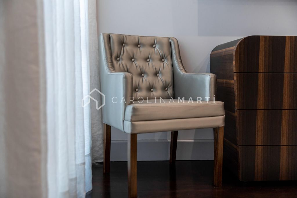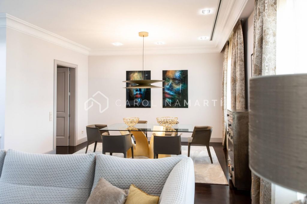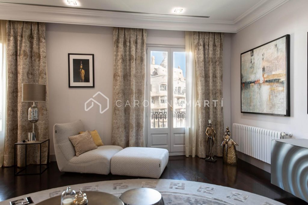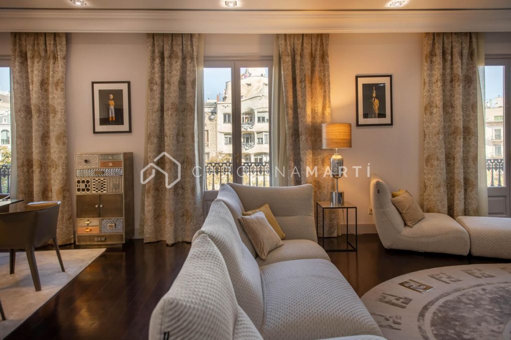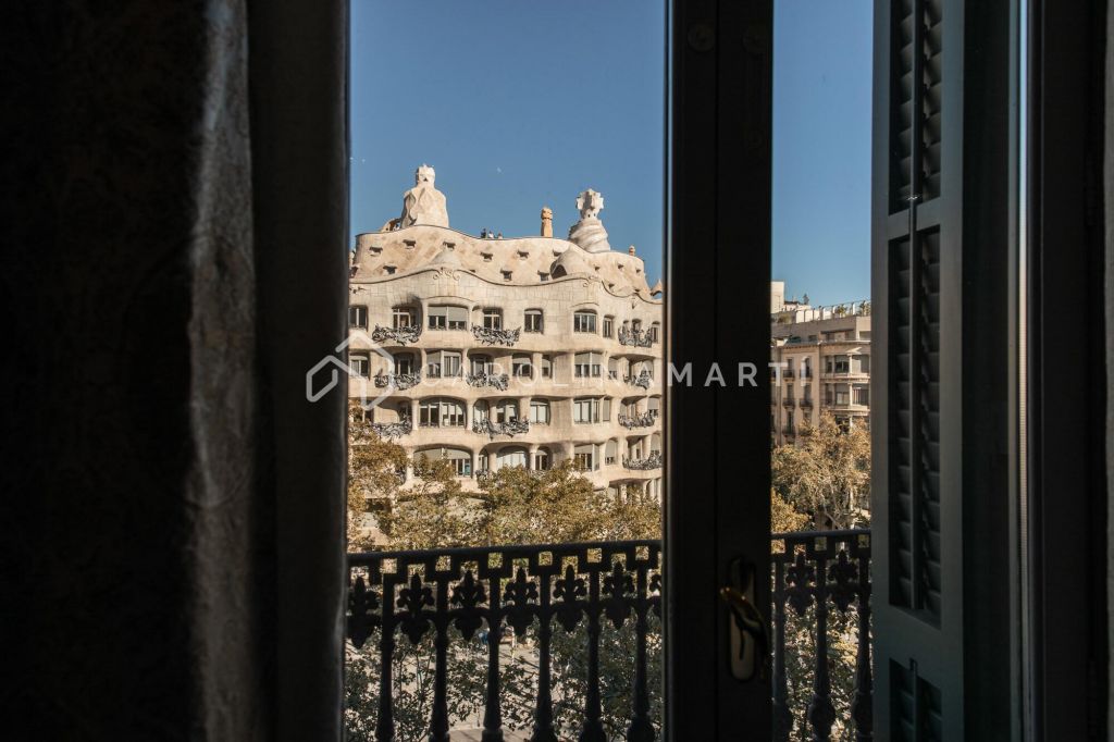La zone de jour se distingue par un grand salon–salle à manger doté de grandes fenêtres laissant entrer une lumière naturelle abondante, tout en offrant une vue privilégiée sur la célèbre Casa Milà – La Pedrera, chef-d’œuvre de Gaudí. La propriété comprend également une cuisine indépendante entièrement équipée et une chambre de service avec salle de bain privée.