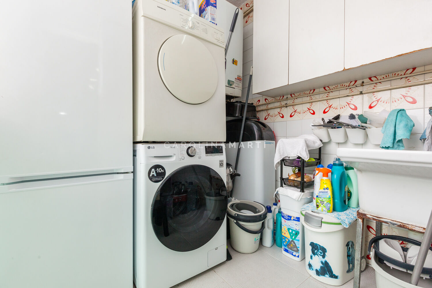 Avec 152 m² construits, le logement s’organise actuellement sur deux niveaux distincts. Au niveau principal se trouve le logement principal, avec une distribution confortable et lumineuse. Il dispose d’un salon-salle à manger de plus de 30 m² avec accès direct à une impressionnante terrasse de plus de 120 m², un espace extérieur peu courant en ville qui agrandit clairement l’espace de jour et permet de profiter de l’extérieur avec un confort absolu. La cuisine équipée communique également avec l’espace buanderie, apportant davantage de fonctionnalité à l’ensemble.