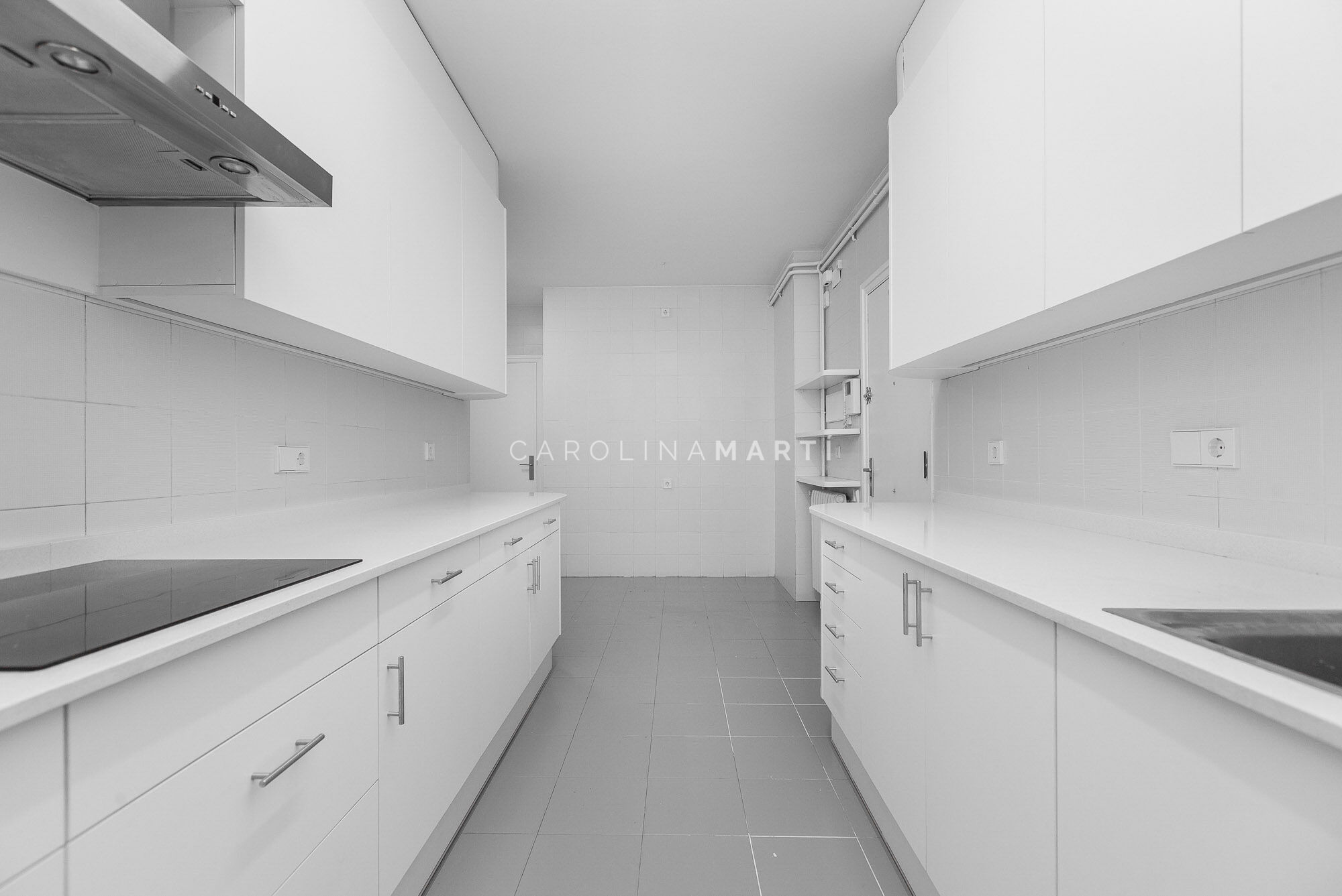 Con una superficie de 140 m², el piso es completamente exterior y destaca por su luminosidad y su cuidada distribución. La zona de día ofrece un amplio salón-comedor con salida directa a una terraza de 10 m², desde la que se disfrutan agradables vistas al jardín y una orientación al mar que aporta luz natural durante todo el día. La cocina, tipo office, cuenta con galería independiente, aseo, zona de lavandería y acceso de servicio.